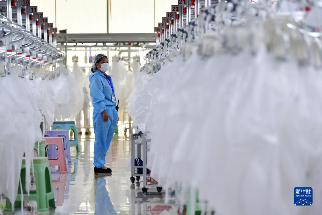 在甘肅省臨夏回族自治州積石山保安族東鄉(xiāng)族撒拉族自治縣,依托東西部扶貧協(xié)作平臺引進(jìn)的服裝加工企業(yè)甘肅拓奇扶貧車間的員工在服裝加工生產(chǎn)線上作業(yè)(2020年8月9日攝)。新華社記者 陳斌 攝