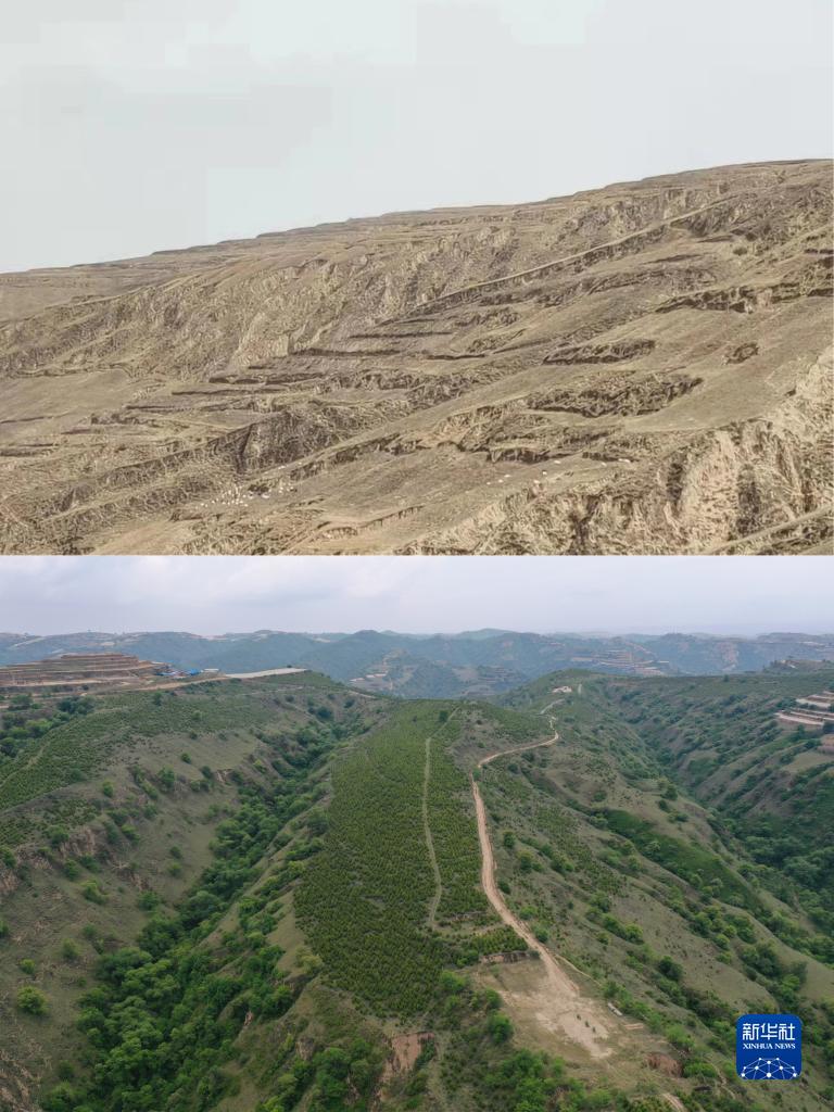 拼版照片:上圖為2013年拍攝的甘肅省慶陽市華池縣南梁鎮(zhèn)高臺村荒山景象(資料圖片,華池縣自然資源局供圖);下圖為2022年5月25日拍攝的甘肅省慶陽市華池縣南梁鎮(zhèn)高臺村萬畝苗林示范點景象(無人機(jī)照片,新華社記者杜哲宇攝)。新華社發(fā)