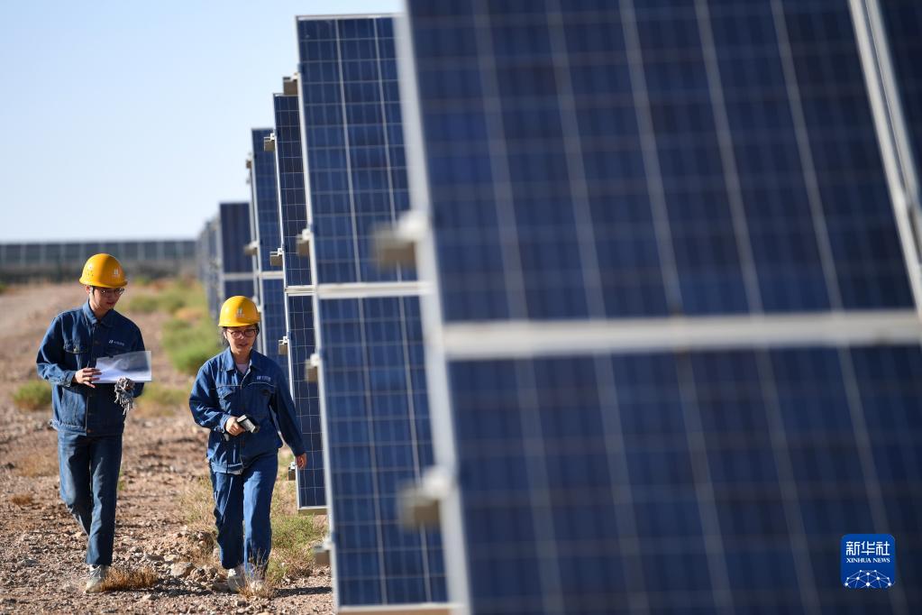2022年6月13日,光伏電站工作人員李靜(右)和同事在甘肅省金昌市華能集團(tuán)西坡光伏電站現(xiàn)場巡檢。新華社記者 陳斌 攝