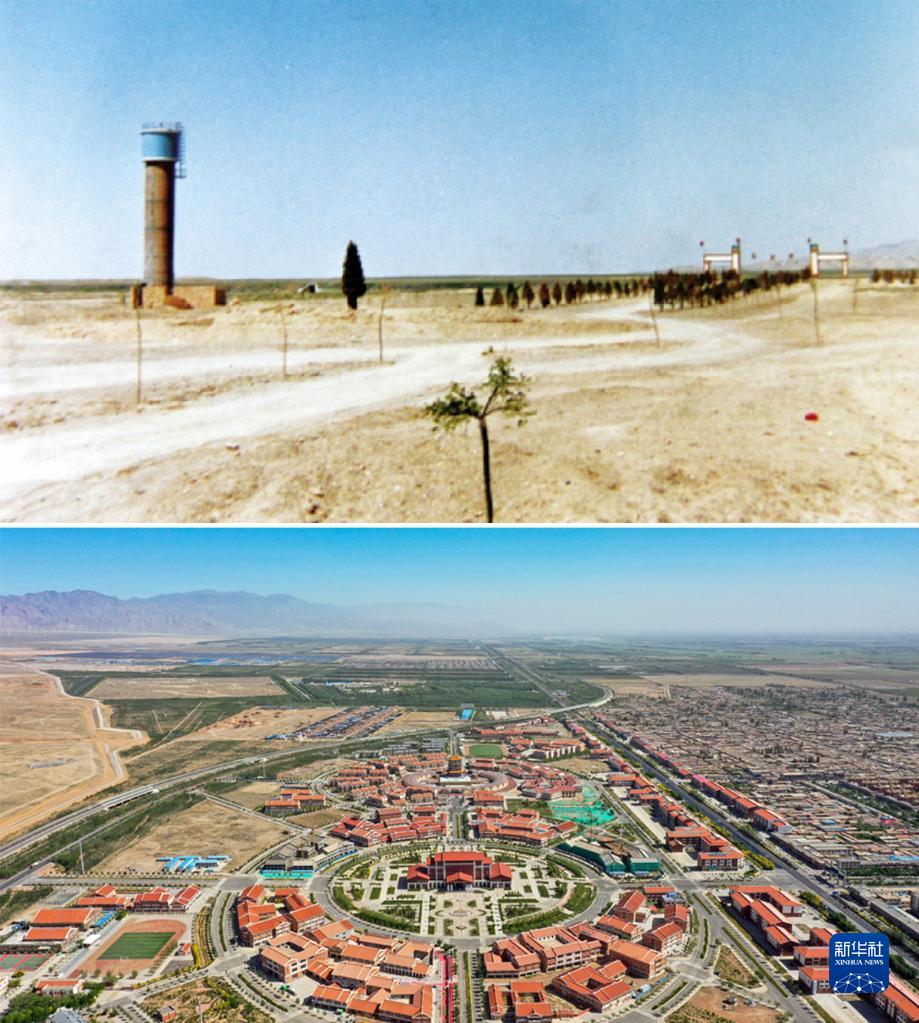 拼版照片:上圖為建設(shè)初期的寧夏永寧縣閩寧鎮(zhèn)景象(資料照片);下圖為2021年6月3日拍攝的寧夏永寧縣閩寧鎮(zhèn)(新華社記者馮開華攝,無人機(jī)照片)。新華社發(fā)