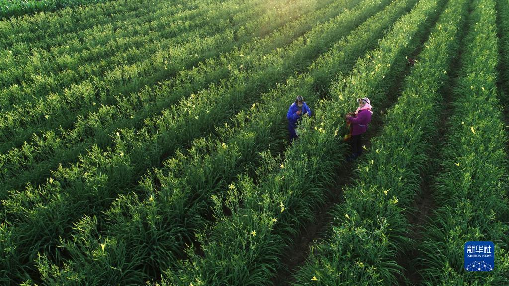 農(nóng)戶在寧夏吳忠市紅寺堡區(qū)柳泉鄉(xiāng)黃花菜基地采摘黃花菜(2022年7月5日攝,無人機(jī)照片)。新華社記者 王鵬 攝