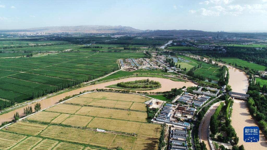 位于黃河分水口的寧夏青銅峽市大壩鎮(zhèn)韋橋村(2022年7月5日攝,無人機(jī)照片)。新華社記者 王鵬 攝