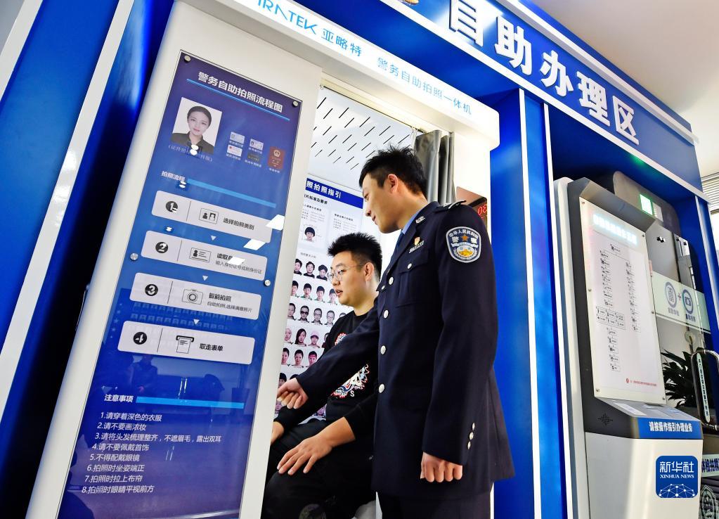 在遼寧省本溪市公安局北地派出所民警指導(dǎo)下,市民通過自助體檢機(jī)完成機(jī)動(dòng)車駕駛?cè)藱z測(cè)項(xiàng)目(2021年12月10日攝)。新華社發(fā)