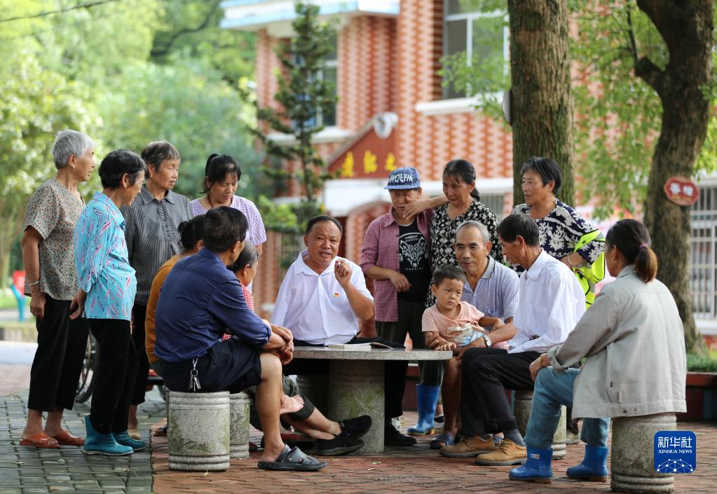 江西蘆溪縣宣風(fēng)鎮(zhèn)珠亭村人民調(diào)解員陽昌紹(中)為珠亭村的百姓宣講民法典知識(shí)(2021年8月17日攝)。新華社記者 胡晨歡 攝