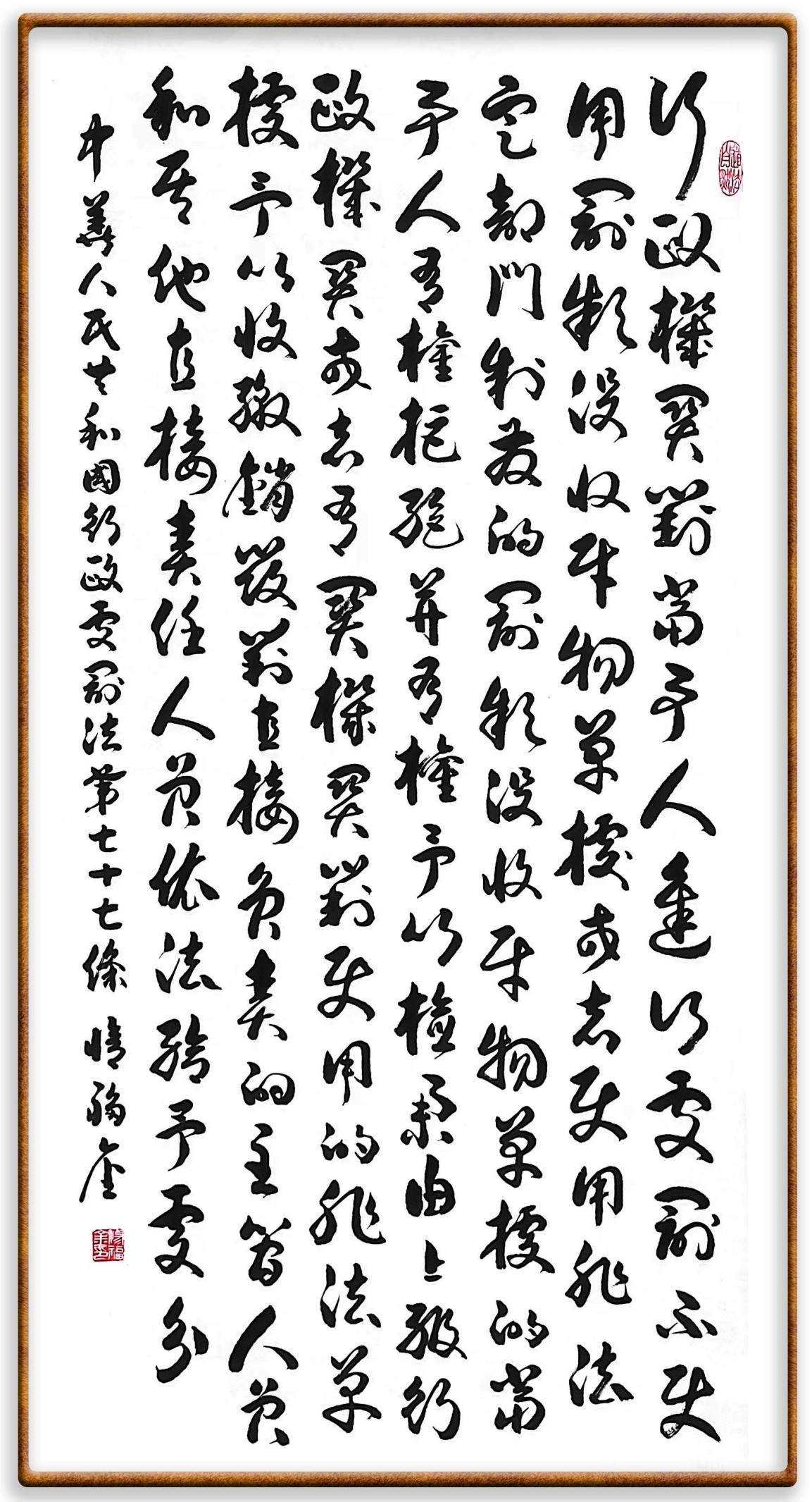 繼《中華人民共和國(guó)民法典》《中華人民共和國(guó)土地管理法》《中華人民共和國(guó)土地管理法實(shí)施條例》《中華人民共和國(guó)法律援助法》之后,法治日?qǐng)?bào)社聯(lián)合北京市司法局、北京書(shū)法家協(xié)會(huì),將筆端對(duì)準(zhǔn)《中華人民共和國(guó)憲法》和《中華人民共和國(guó)行政處罰法》。