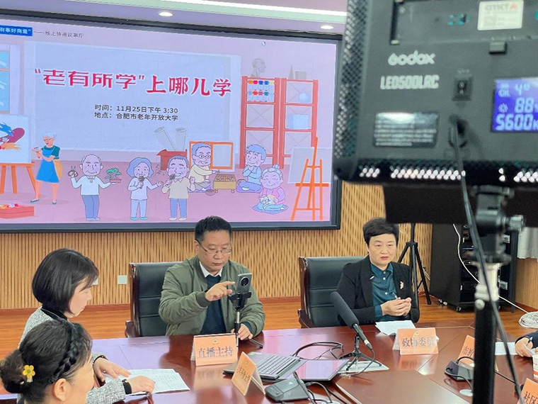 三臺攝像機、一個電子大屏、兩個補光燈……這是直播現(xiàn)場,也是線上協(xié)商議事廳。合肥老年開放大學(xué)內(nèi)的會議室正在進行一場關(guān)于“‘老有所學(xué)’上哪兒學(xué)”的線上協(xié)商議事直播活動。