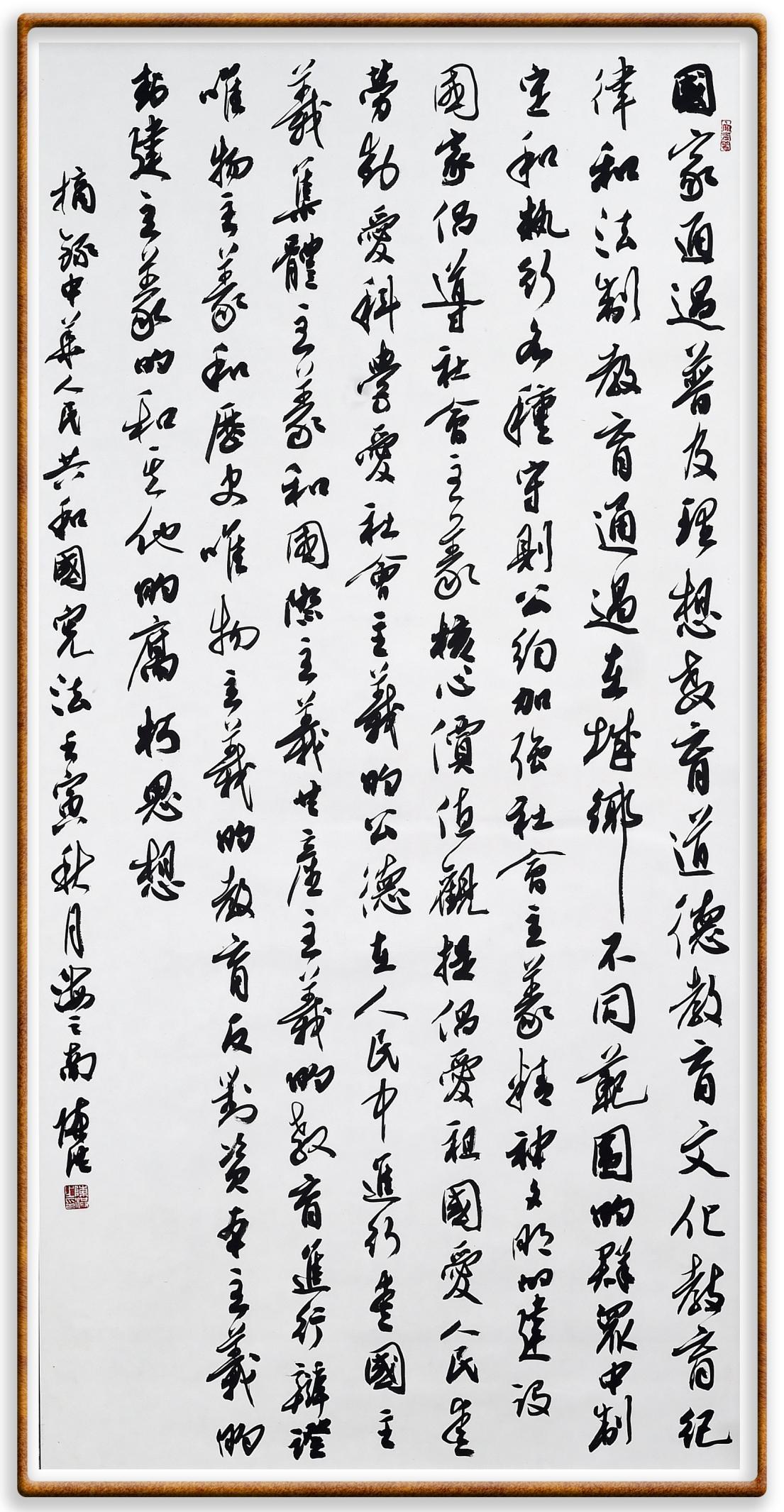 繼《中華人民共和國(guó)民法典》《中華人民共和國(guó)土地管理法》《中華人民共和國(guó)土地管理法實(shí)施條例》《中華人民共和國(guó)法律援助法》之后,法治日?qǐng)?bào)社聯(lián)合北京市司法局、北京書(shū)法家協(xié)會(huì),將筆端對(duì)準(zhǔn)《中華人民共和國(guó)憲法》和《中華人民共和國(guó)行政處罰法》。